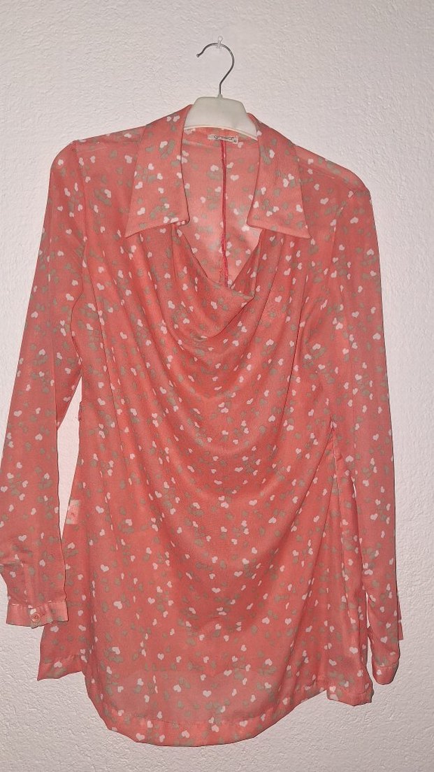 Salaş kesim, uzun kollu, drapeli V yakalı, pastel pembe baskılı vintage bohem tarzı bluz.