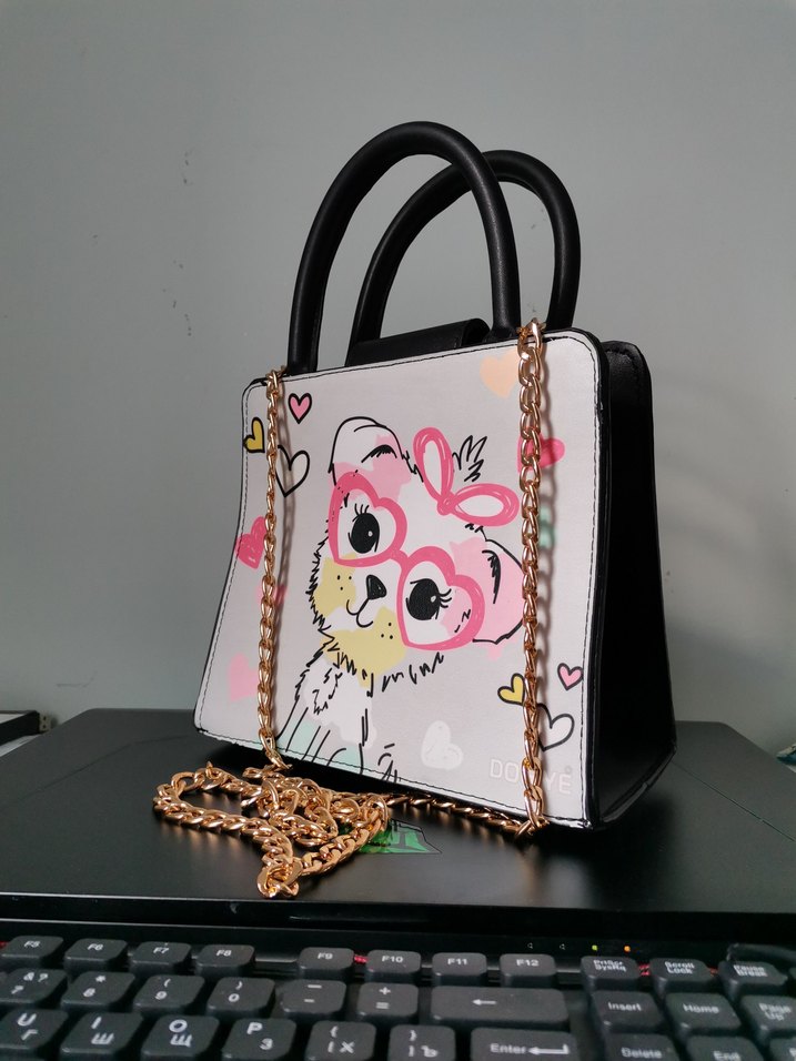 Renkli baskılı kadın çantası, pembe gözlük takan sevimli karakter desenli. Siyah saplı, altın renk zincir detaylı, sentetik kumaştan, sokak modasına uygun.