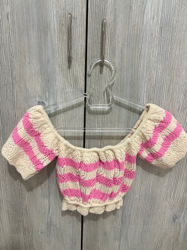 Pastel pembe ve krem renkli batik desenli, örgü kumaştan yapılmış, kayık yaka ve askılı kollu, bohem tarzda dar kesim bolero bluz. El örmesidir bedeni s m hepsine uymaktadır.