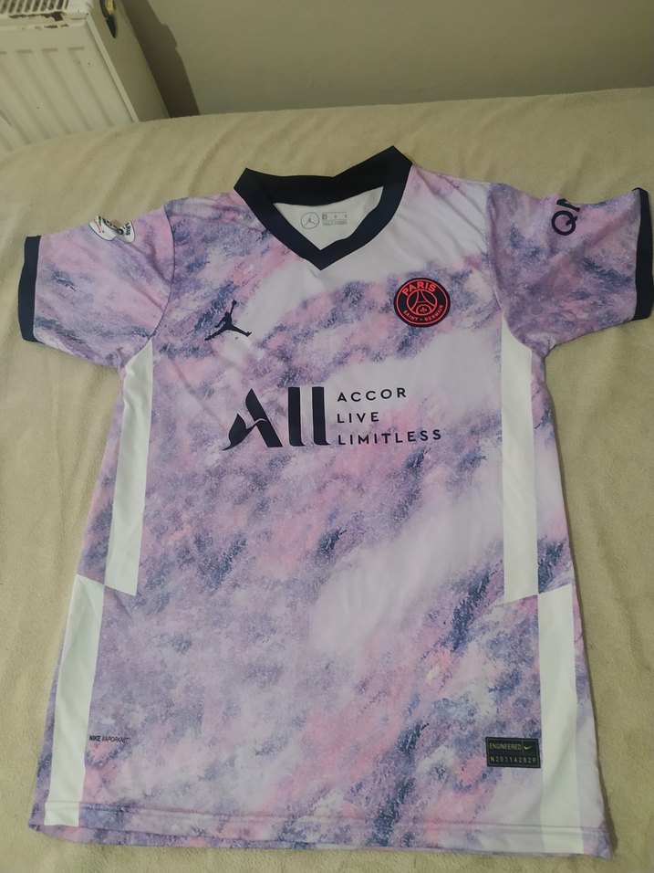 Düğmeli ve kısa kollu, pembe batik desenli, vücuda oturan erkek spor tişörtü. Sentetik kumaştan, outdoor kullanıma uygun.