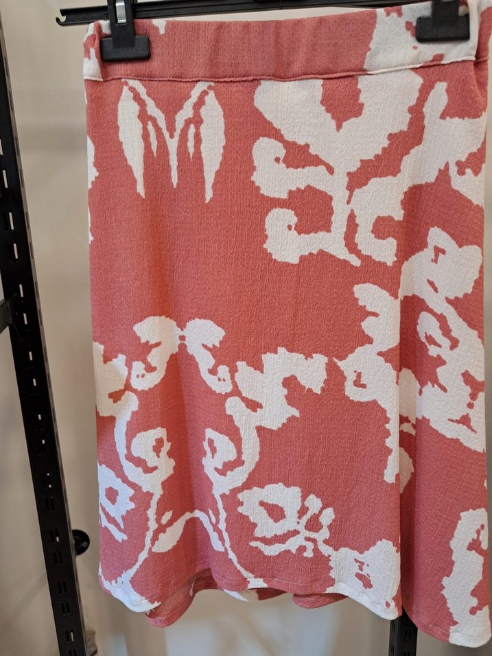 Pembe ve beyaz batik desenli, bol kesim hamile mini etek. Drapeli tasarımıyla rahat ve bohem bir görünüm sunar. Günlük kullanım için uygundur.