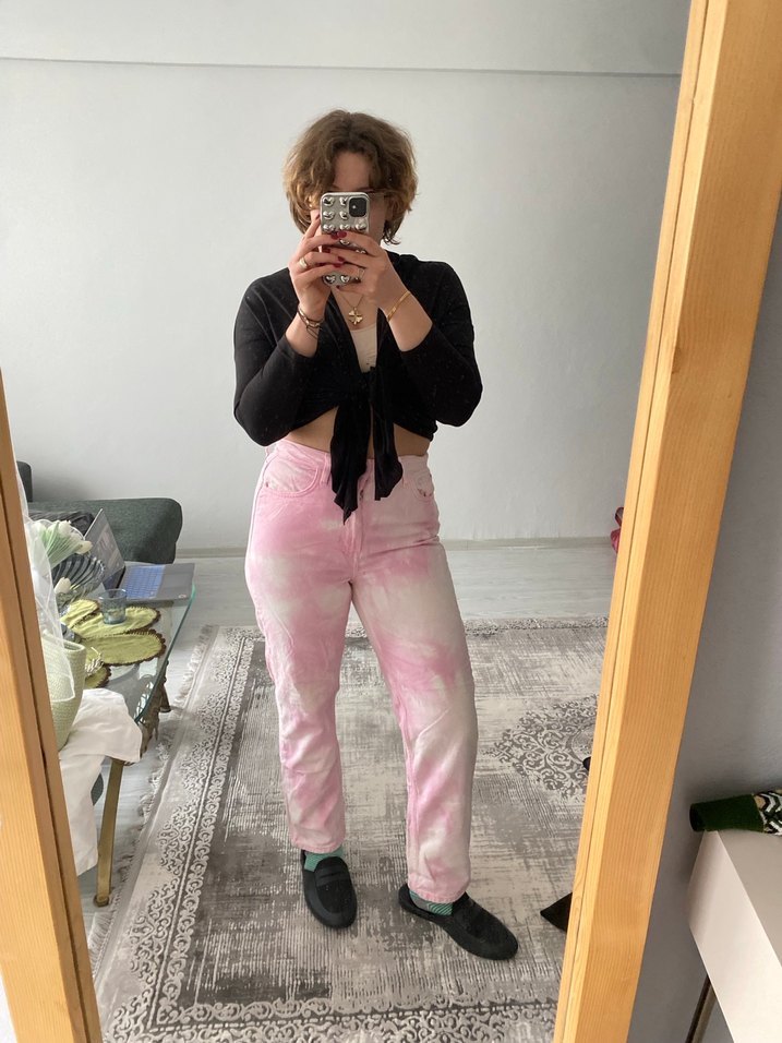 Pembe batik desenli denim kadın boyfriend kot pantolon, bol kesim ve midi boyda. Rahat ve şık sokak stili için uygundur. Pembe batik jean.