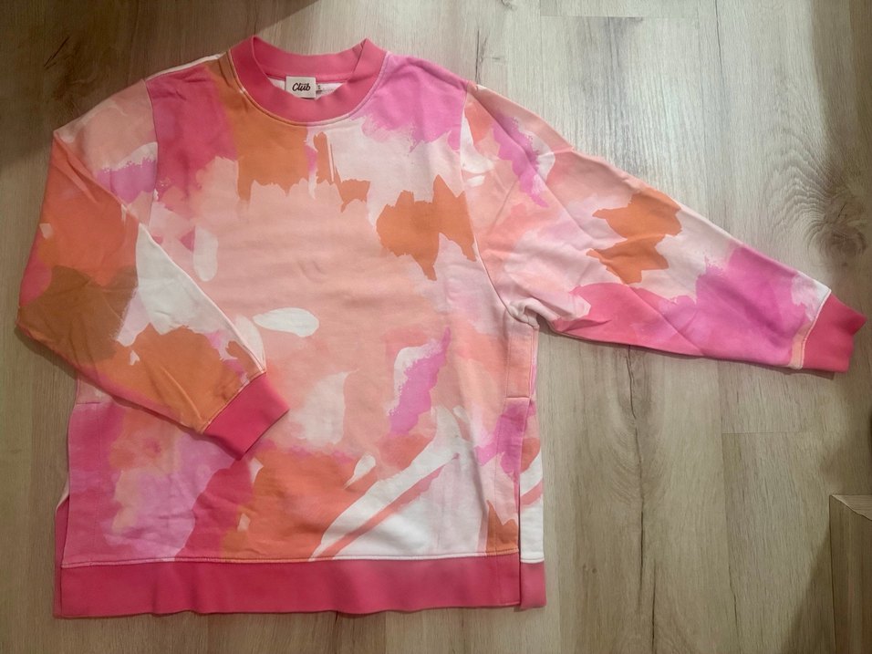 Uzun kollu ve yuvarlak yakalı, bol kesim pembe batik desenli kadın sweatshirtü. Yumuşak sentetik kumaştan, günlük kullanıma uygun.