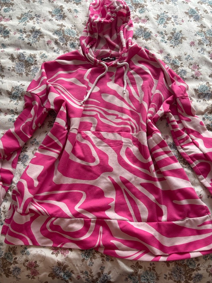 Pembe batik desenli, kapüşonlu ve uzun kollu sweatshirt. Sentetik yumuşak kumaştan, bol kesim ve fırfır detaylı, günlük rahat kullanım için idealdir.