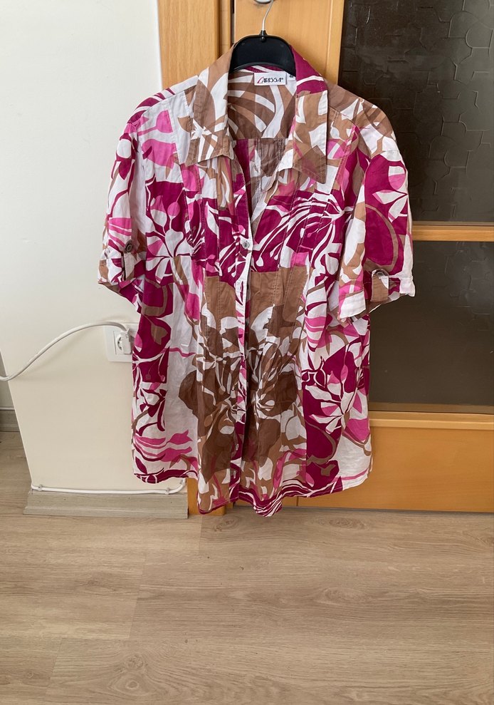 46 Beden, temiz hasarsız ürün. Pembe batik desenli, kısa kollu, düğmeli ve yakalı, bol kesim kısa uzunlukta yumuşak dokulu gömlek. #gömlek