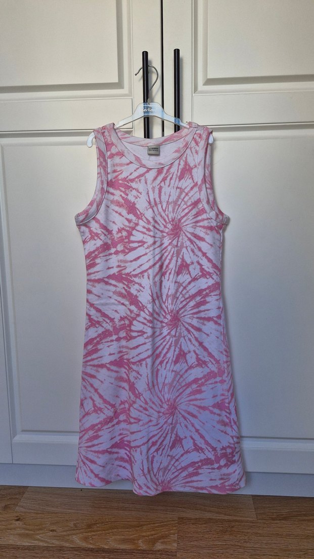 Pembe pastel tonlarda batik desenli, kolsuz elbise bir defa giyildi