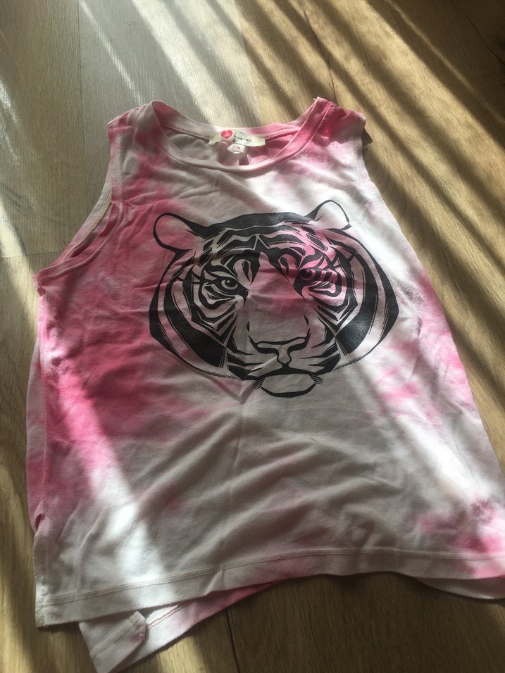 Pembe pastel batik desenli, önünde baskılı kaplan yüzü olan kolsuz kız tişörtü. Yuvarlak yaka ve rahat bol kesimlidir.