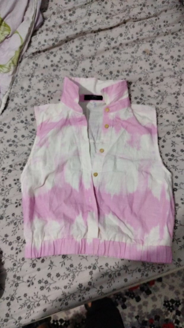 Yumuşak pamuktan yapılmış, yakalı ve düğmeli kolsuz yelek. Pastel pembe batik deseni ve rahat kesimiyle günlük sokak stiline uygun.