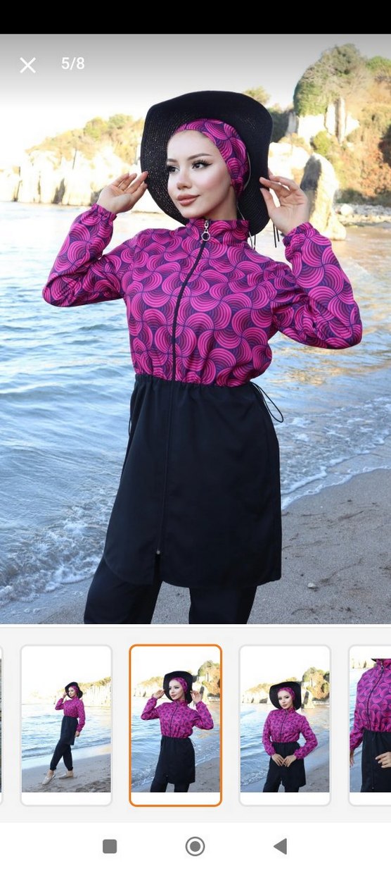 Pembe batik desenli, kısa kesim ve bol kesim mayo Uzun kollu, yüksek yakalı ve ayarlanabilir bel lastikli, fermuarlı tasarım.