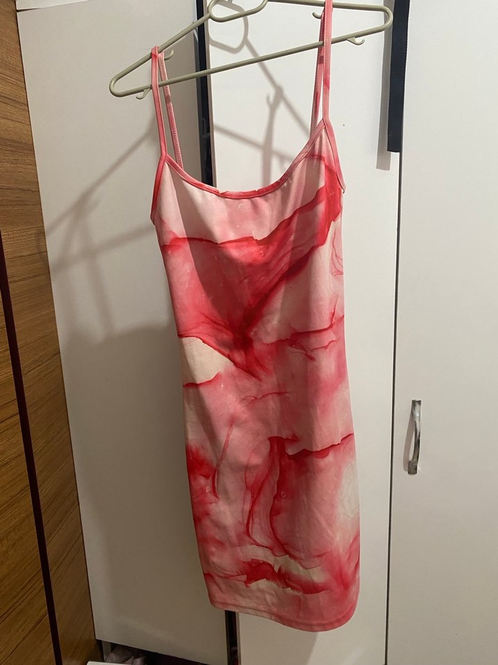 Pastel pembe batik desenli, ayarlanabilir askılı hafif ve likralı mini elbise