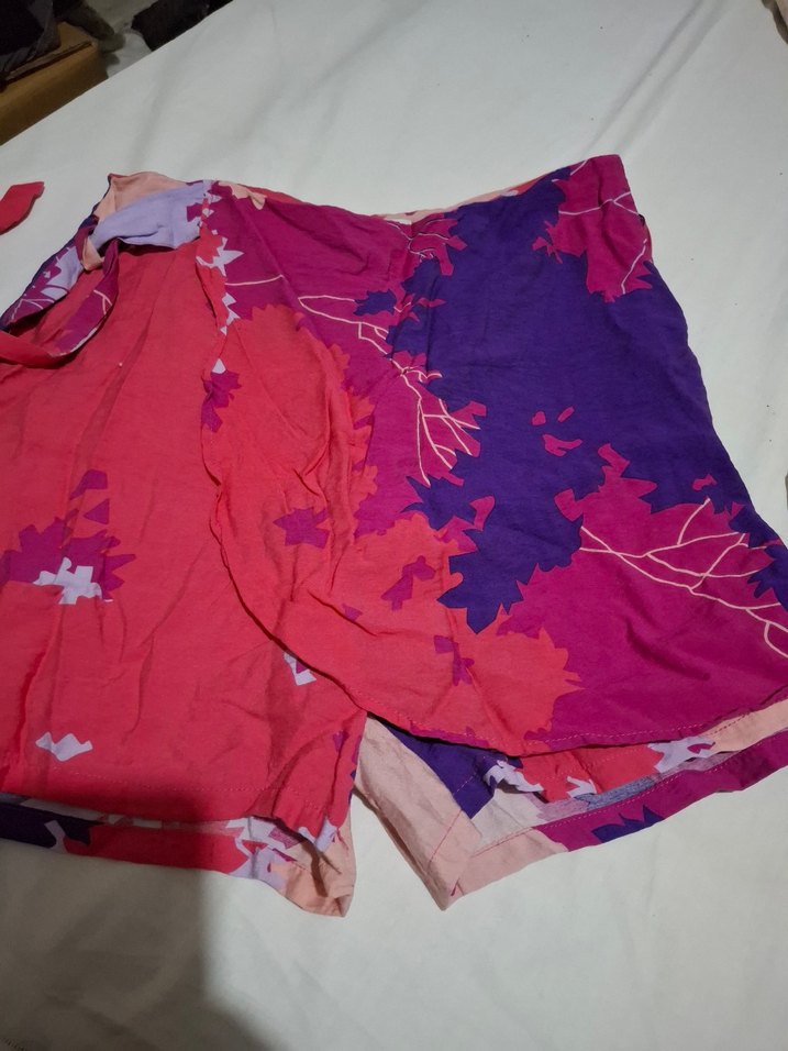 Sentetik kumaştan yapılmış, pembe batik desenli, salaş kesim ve drapeli mini şort, günlük kullanım için canlı bohem tarzı sunar.