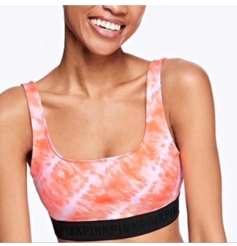 Pembe pastel batik desenli, kare yaka spor sütyeni, destekleyici siyah "PINK" yazılı bant ile athleisure ve streetwear tarzını birleştirir. Turuncu ve beyaz renklerdeki desenli büstiyer. Günlük kullanım için ideal. #victoriassecret #pink #bra #bralet #sporcusütyenı iç destegı yoktur #batik desenli #turuncu #beyaz