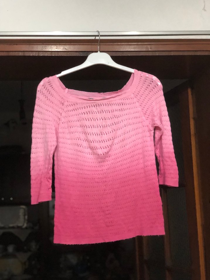 Kadınlar için triko kazak, tekne yaka ve dirsek kolludur. Yumuşak triko kumaş ve pastel pembe batik desenlidir. Orta boyda, günlük kullanım için uygundur. Üç kısımlarında çok çok hafif tüylenme var resimde de görüldüğü gibi belli olmuyor üstte.
