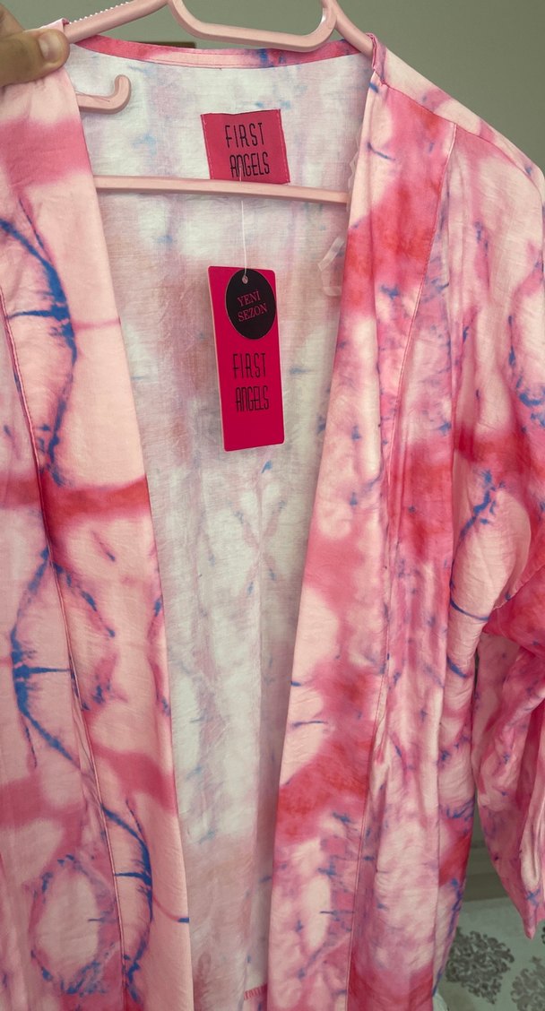 Pembe pastel tonlarında batik desenli, uzun ve bol kesim kadın kimono. İpek gibi yumuşak kumaş, uzun kollu, yakası yaka detaylı ve düğmeli olarak tasarlanmıştır.