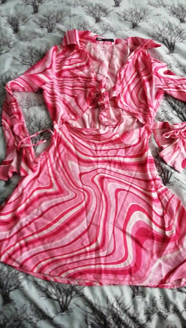 Uzun kollu, v yaka, drapeli ve pembe batik desenli, Yumuşak sentetik kumaştan yapılmıştır, romantik akşamlar için ideal. Göğüs kısmından bağlamalı