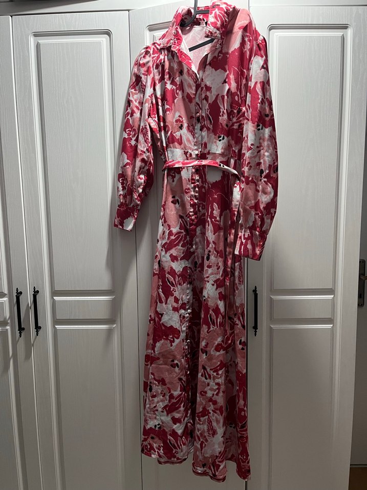 Pembe batik desenli, uzun kollu, yakalı ve bol kesim kadın elbisesi. Sentetik kumaştan, drapeli ve çağdaş Paris tarzı ile avangart dokunuşlar taşır. Herhangi bir kusuru yok sadece bir defa giyildi