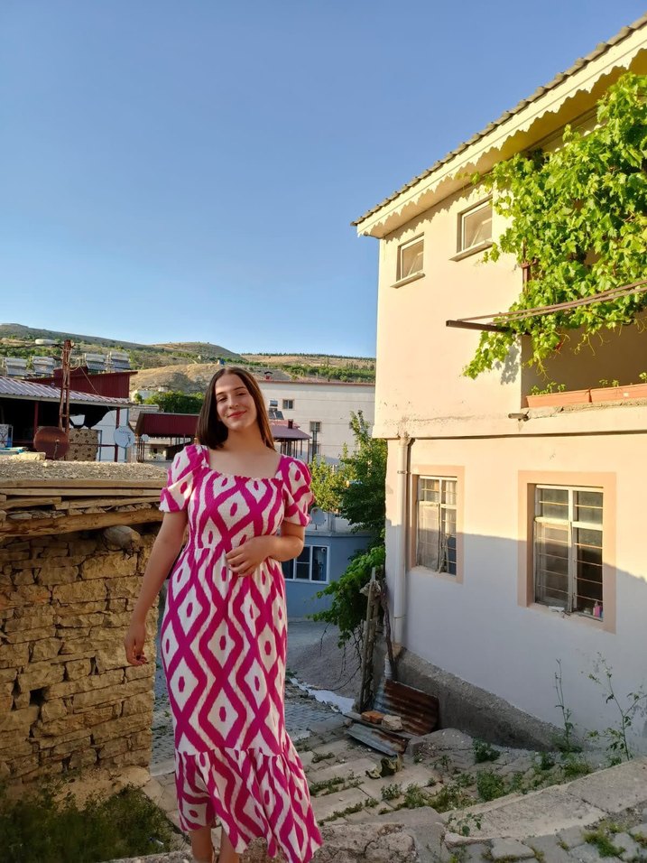Pembe Batik Desenli Uzun Salaş Elbise