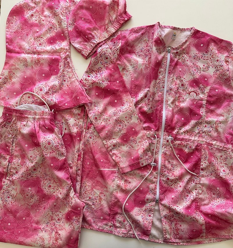 Pembe Batik Desenli Uzun tesettür mayo bonesi ve başlığı 4 parça