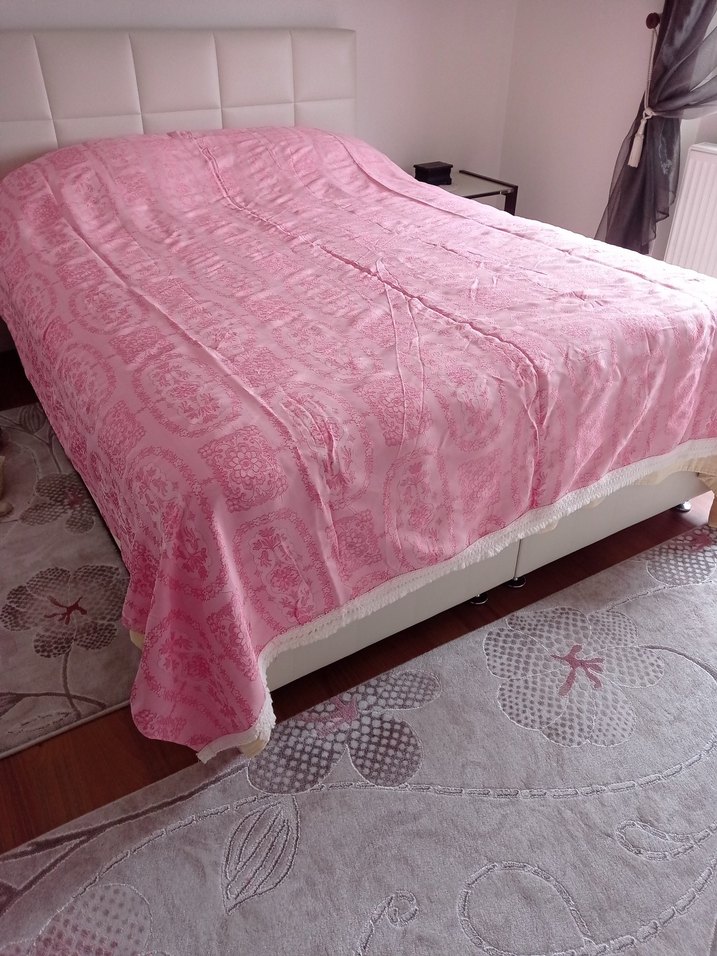 Pastel pembe batik desenli yatak örtüsü, yatak odasına yumuşak ve sakin bir hava katar. Hafif dokusuyla yatağı düzgünce kaplar. boy 2.40 en 2 metredir bilginize hiç kullanılmadı yurt dışından