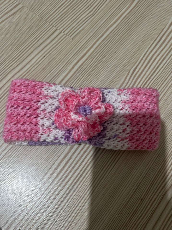 Renkli çiçek detaylı, pembe batik örgü çocuk saç bandı. Bohem tarz için uygun. Pembesi ve kremi var