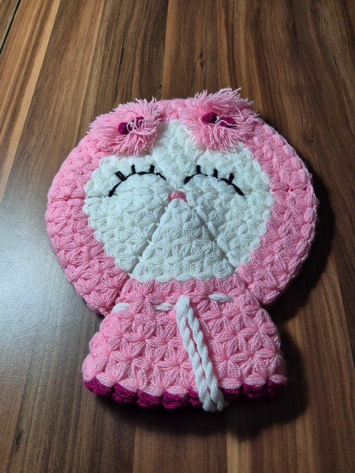 Pastel pembe renkte, baykuş şeklinde dokuma desenli, kapalı göz detaylı yumuşak ve emici banyo süngeri. (Derya)