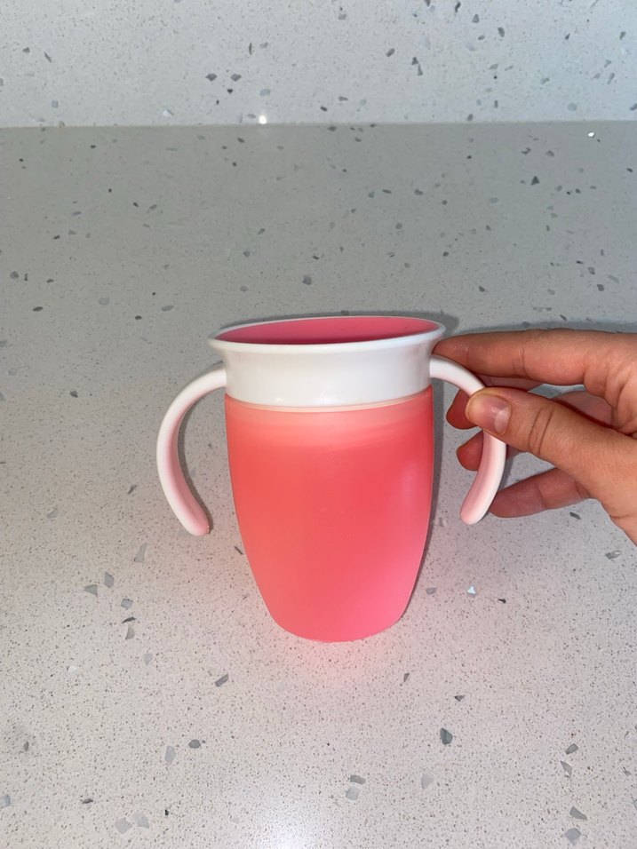 İki kulplu, kolay tutuş sağlayan pembe renkli bebek alıştırma bardağı. Çok az kullanıldı hiç bi kusuru yok temiz durumda