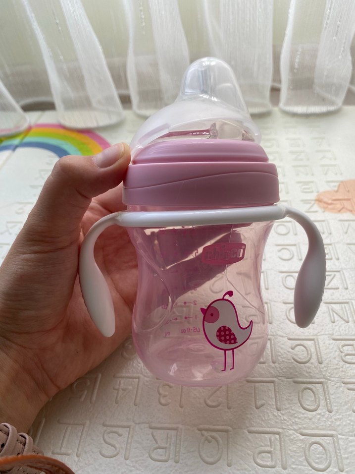 Pastel pembe renkte, yumuşak emzikli ve kolay tutuş sağlayan kulplu bebek biberonu, küçük kuş çizimiyle süslenmiştir.