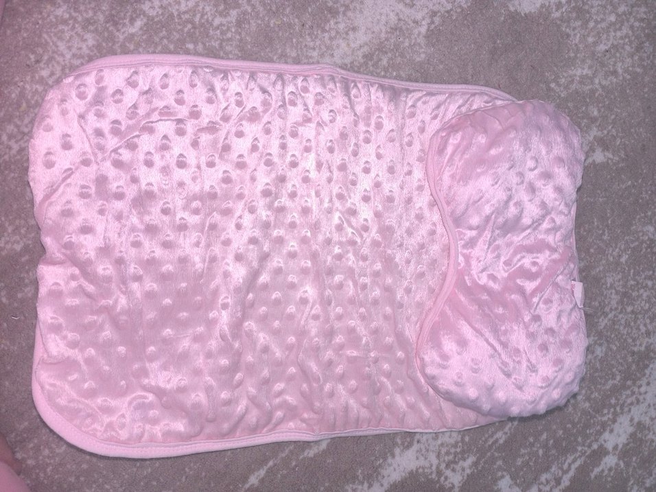 Desensiz pembe renkte, yumuşak ve rahat dokulu sentetik kumaştan yapılmış bebek battaniyesi.
