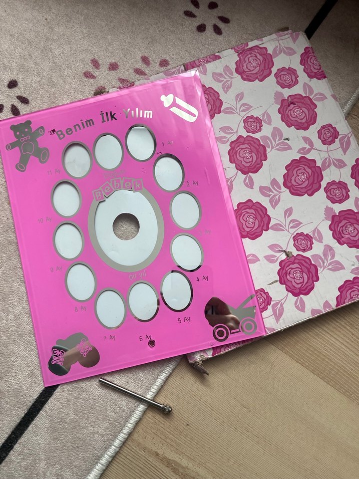Pembe renkli, yuvarlak fotoğraf alanları ve çiçek desenleriyle bebek ilk yıl anıları için planlayıcıdır. Bebek anı çerçevesi