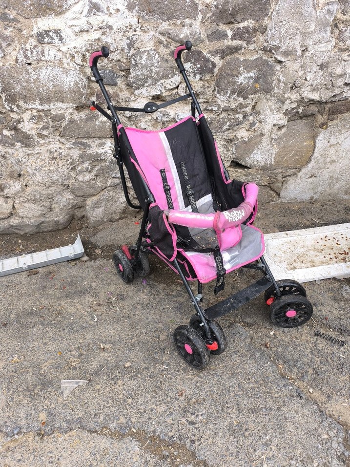 Pastel pembe renkte, hafif çerçeveli, emniyet kemerli konforlu oturma alanına sahip bebek arabası. Dört çift tekerlek ile kolay kullanım sağlar.