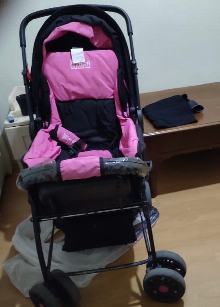 Koyu pembe renkli, yastıklı oturma alanı ve güvenlik kemeri bulunan, sağlam çerçeveli ve ön tekerlekleriyle kolay hareket sağlayan bebek arabası.