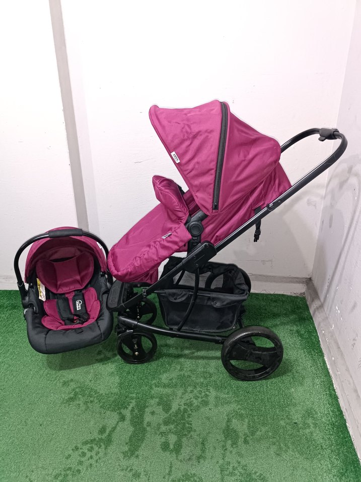 Koyu pembe renkte, tente ve alt kısmında saklama sepeti bulunan bebek arabasıdır. Yanında uyumlu oto koltuğu mevcuttur. Rahat tutma saplı sağlam çerçeveye sahiptir. Hiçbir sorun sıkıntısı yok tertemiz sağlamdır alabilirsiniz bende birsürü bebek arabası var sayfama bakabilirsiniz