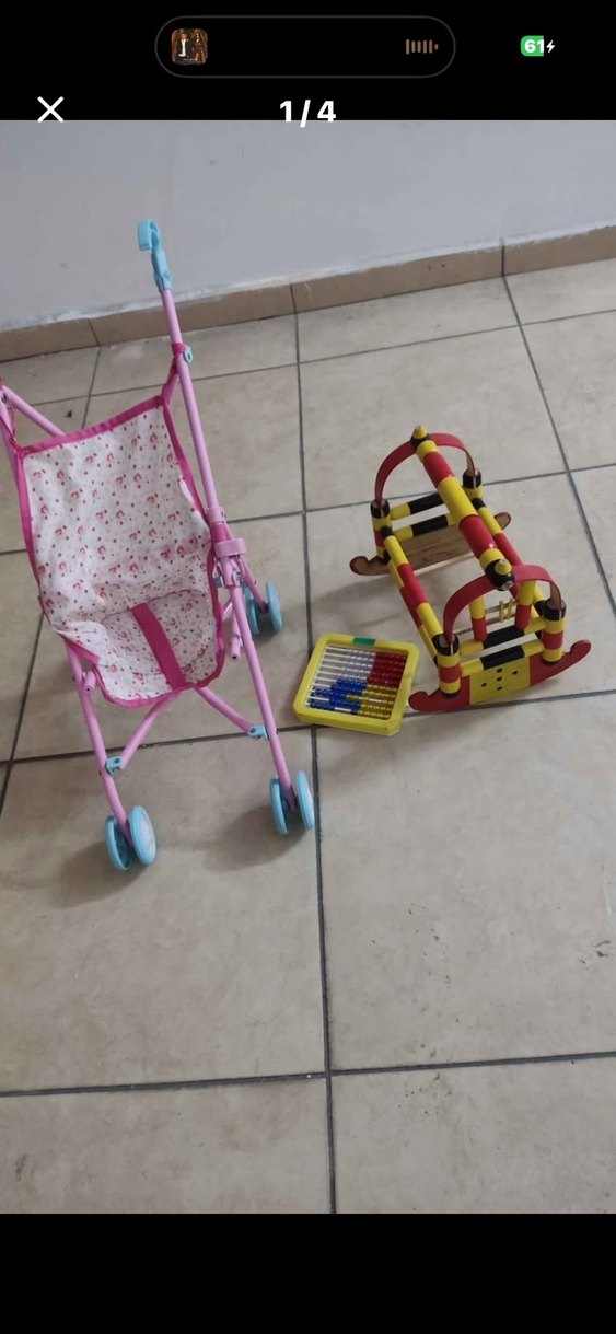 Çiçek desenli pembe oyuncak bebek arabası ve renkli ahşap abaküslü oyuncak seti. Çocuklar için eğlenceli oyun araçları.