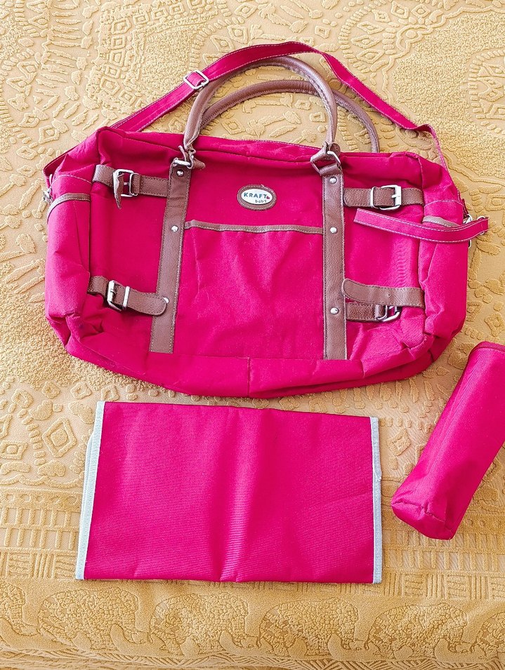 Pembe renkli, desen içermeyen bebek bakım çantası seti. Saplı ve askılı çanta ile uyumlu aksesuarlar içerir.