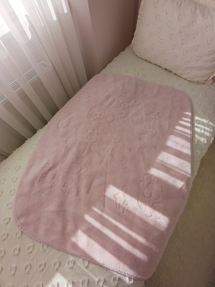 yumuşak ve sıcak kumaştan yapılmış pastel pembe bebek battaniyesi. Rahatlık için ideal.
