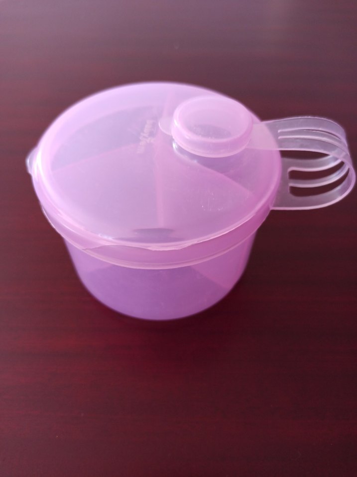 Pembe renkte, kapağı ve taşıma sapı olan bebek besleme kabı. Bebek maması veya için uygun saklama kabıdır. Kapağında ufak bir kırık vardır, kapanmasına engel değildir.