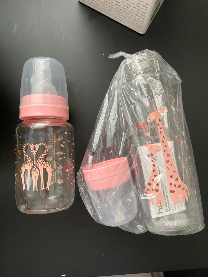 Pastel pembe kapaklı, zürafa desenli iki bebek biberon seti. Birinde emzik ve kapak, diğerinde ekstra parçalarla plastik ambalajlı biberon yer alır. Poşetli büyük ve sıfır kullanılmadı