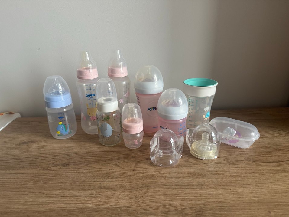 Çeşitli boyutlarda, ölçü işaretli ve farklı emzik kapak tasarımlarına sahip pastel pembe bebek biberonları seti.
