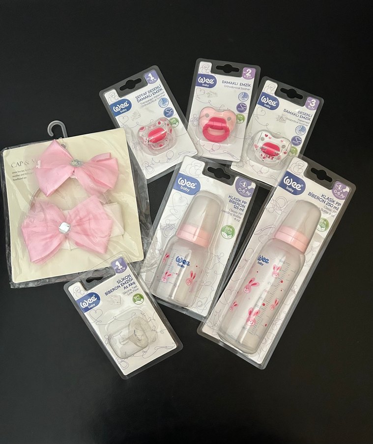Plastikten yapılmış, baskılı detaylara sahip pembe bebek biberonları, emzikler ve anne bebek saç tokası seti.