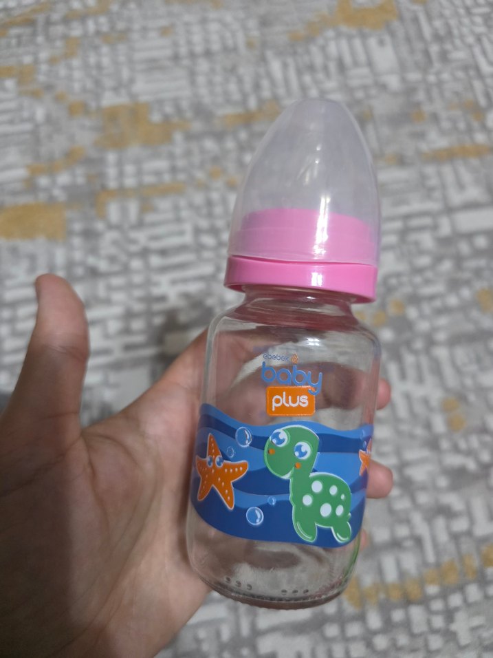 Pastel pembe bebek biberonu, deniz temalı kaplumbağa ve denizyıldızı desenli, "baby plus" markalı ve koruyucu kapaklı.