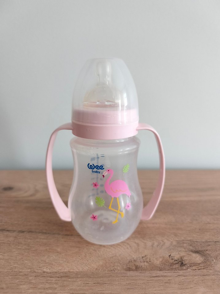 Pastel pembe renkte, flamingo desenli bebek biberonu. Kolay tutuş için kulplu ve yumuşak emzikli, şeffaf koruyucu kapaklıdır.