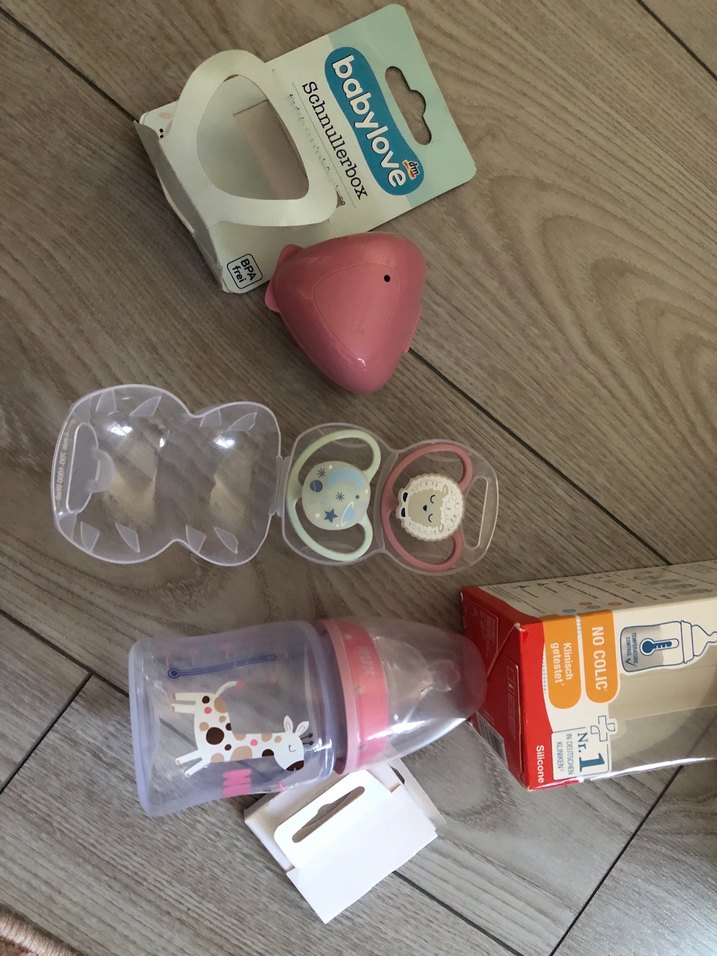 Pembe zürafa desenli bebek biberonu, iki emzik ve emzik kutusu içeren set. Tüm ürünler sıfır hedıye geldı hiç kullanılmadı nuk marka 0-6 ay kullanıma uygun ürünler.biberon cam değil plastıktır .doğal ahşap bebek tarağı