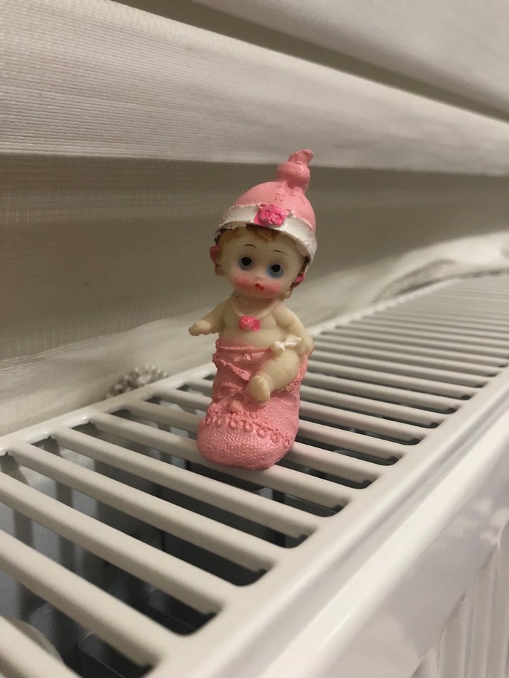Şapkalı ve bot içinde oturan pastel pembe bebek figürin. İnce yüz hatlarına ve sevimli bir ifadeye sahip.