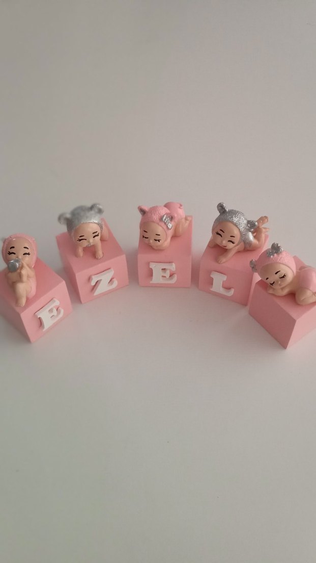 Üzerinde bebek figürleri olan pastel pembe harf blokları. Bebekler küçük kanatlar ve taç gibi detaylara sahip. İstenilen isim yazılabilir