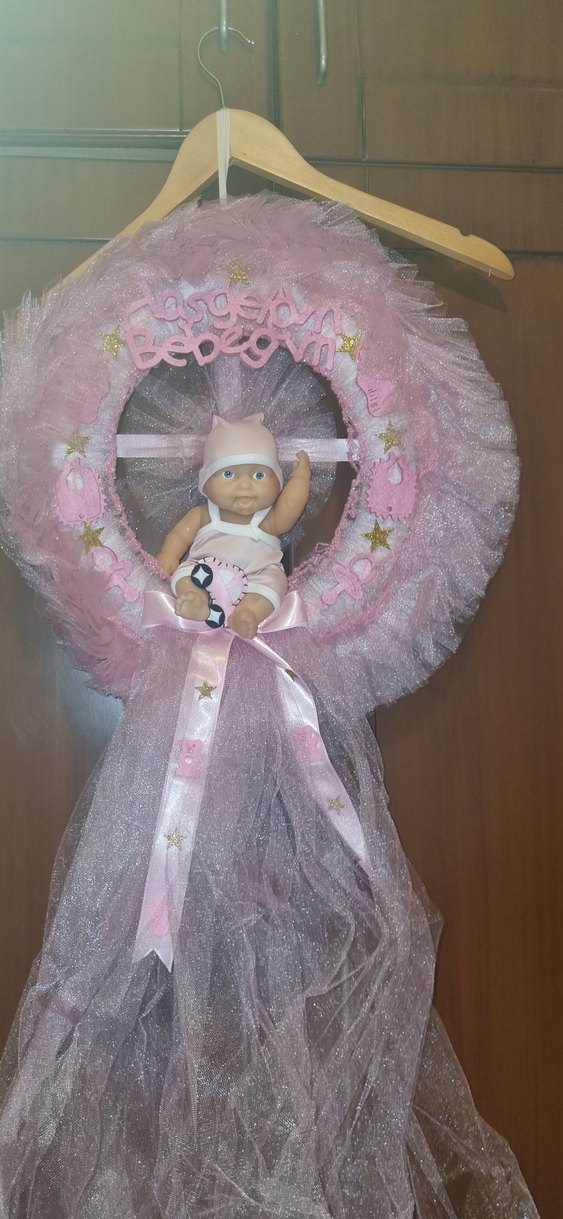 Pembe pastel renkte tül ve kurdele detaylı kapı süsü, ortasında uyumlu kıyafetli bebek figürü yer alıyor. Yeni doğan bebeğim eve geldiğinde 1 defa Evdeki kapıya takılıp çıkarılmıştır.