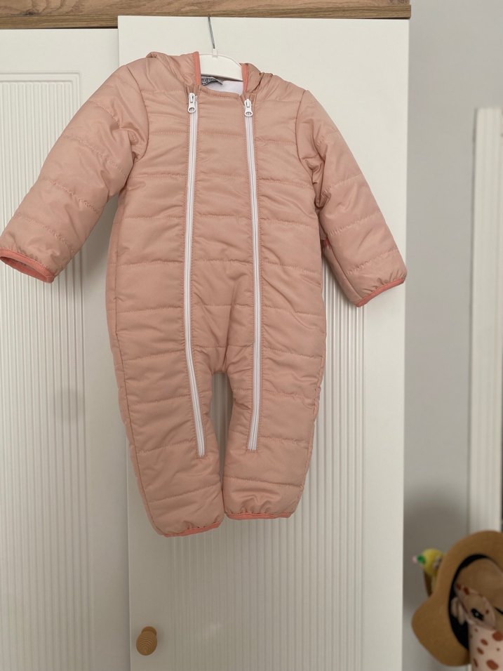 Pastel pembe renkte, çift fermuarlı, yakası kesimli bebek kayak tulumu. Tek parça, desensiz tasarımıyla tam koruma ve sıcaklık sağlar. ❄️