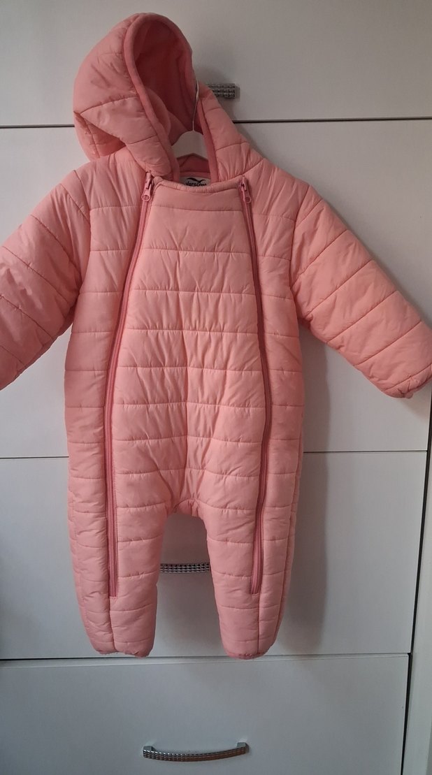 Pastel pembe renkte, fermuarlı ve kapüşonlu bebek kış tulumu, soğuk havalarda bebeği sıcak tutar. ❄️