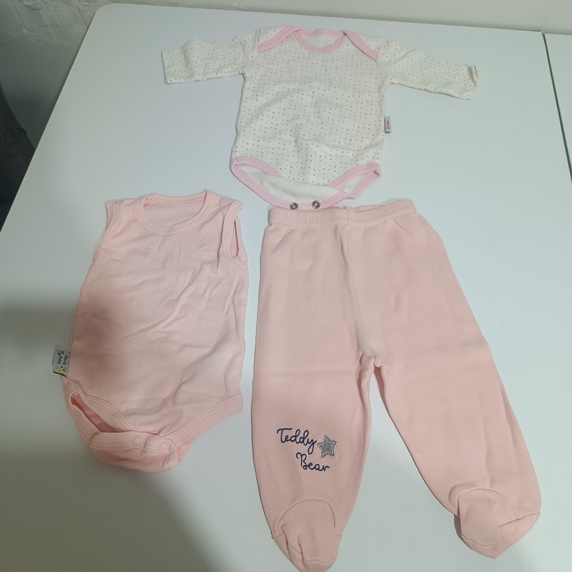Pastel pembe renkte, uzun kollu body, kolsuz body ve ayaklı "Teddy Bear" nakışlı pantolondan oluşan bebek kız 3'lü takımı.