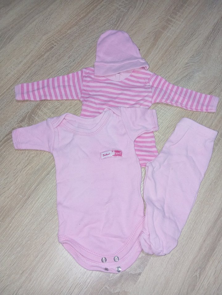 Pastel pembe bebek kız body seti, sade body, çizgili uzun kollu üst, pantolon ve şapka ile rahat ve şık görünüme sahiptir