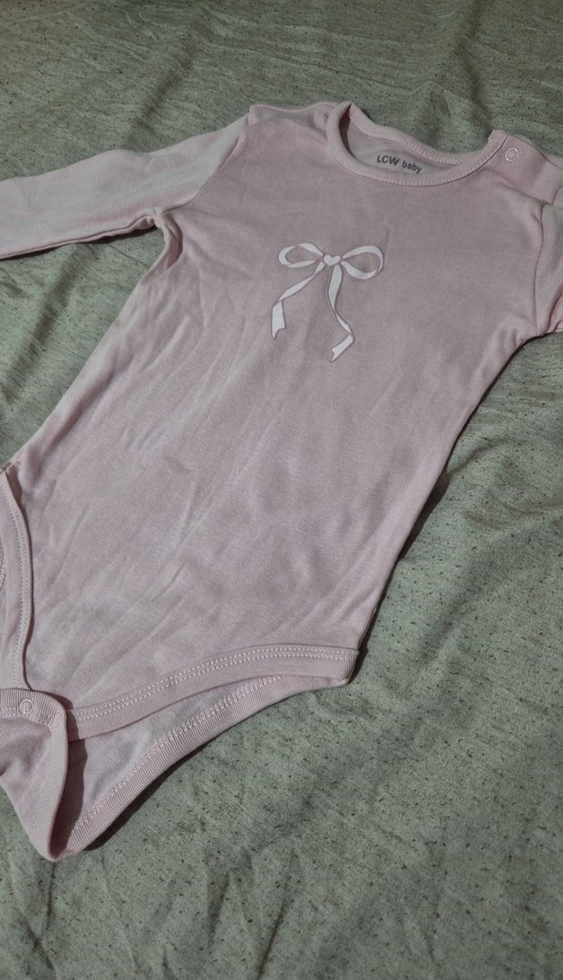 Uzun kollu, yuvarlak yaka pembe bebek kız body, önünde sade bir fiyonk detayı bulunur.